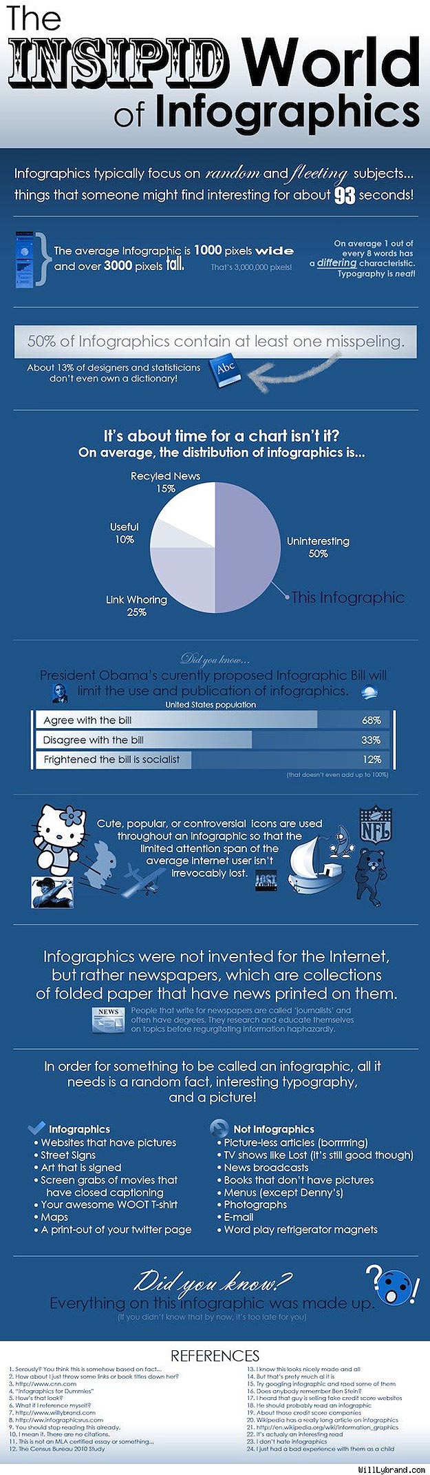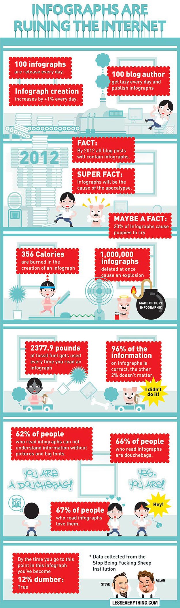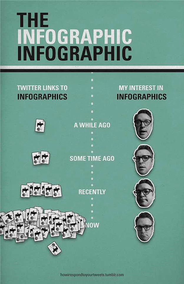 Have you thought about creating your own infographics? You can find them on almost any topic these days. There are truly no limits to the possibilities. I found a really cool article for you that features 10 Awesome Free Tools To Make Infographics, this one that provides some Themes For A Good Infographic and this last one with Infographic Resources. Below are a couple cheeky infographics about infographics. Keep in mind these are sarcastic and just for fun. I wouldn’t take much of the info on these particular infographics seriously, but then again, that’s probably obvious!
