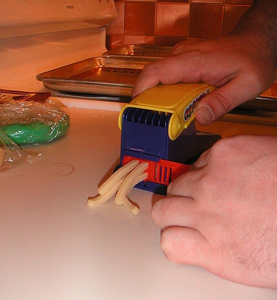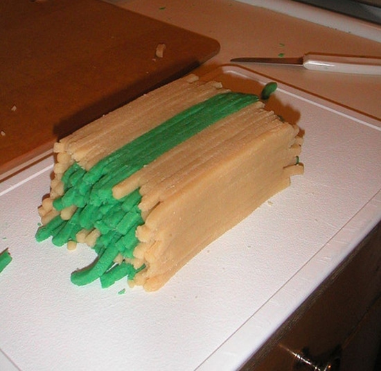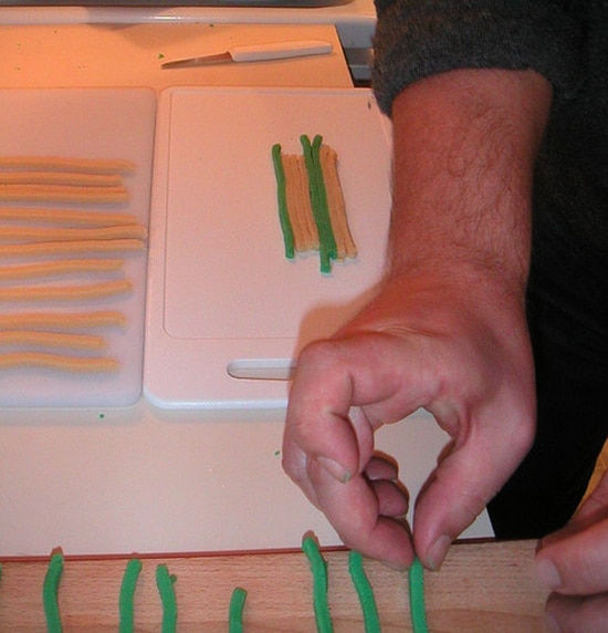 I know how to make really yummy sugar cookie dough from scratch, but what about the pixels? How can the pixel get into the cookie if you know what I mean? I did a quick Internet search and found the answer. You create different colors of dough, roll it out, and slice it into long logs. The video below shows this in detail. Another option, according to SeattleJonman, is to put the dough into a Play-Doh Fun Factory and pump it out. Although that option seems faster and the pieces would be a more consistent size, I’m going to do it the old fashioned way since I don’t have one of those Play-Doh thingys on hand.