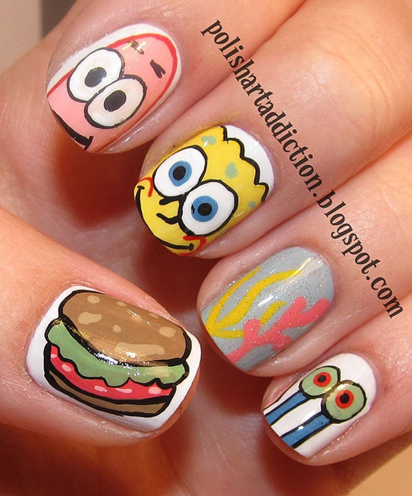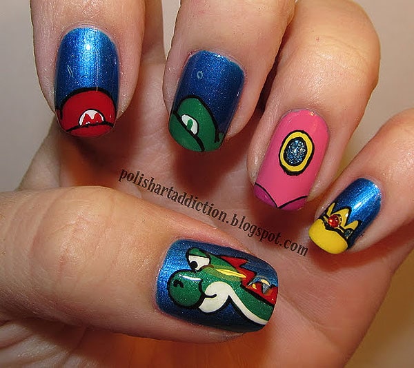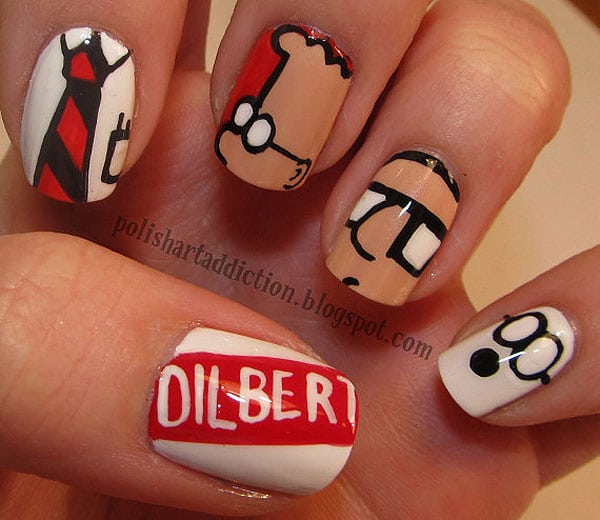 This collection below is from Leslie at Polish Art Addiction. She is a 25-year-old nurse with an obsession with all things nail polish. She made sure to pretty much cover all the necessary cartoon characters on here since she hit up Mario Bros, Star Trek, Sailor Moon, Teen Titans, SpongeBob SquarePants (and Patrick), Dilbert and more. If you click over to her website, you can learn all about how she does it, what kind of brushes she uses and all kinds of other details about this skillful art. According to Leslie, it takes a lot of practice and patience. I can imagine that’s true. If I tried this, something tells me I’d just make a big ‘ol mess.
