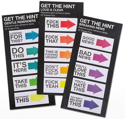 Get The Hint Mini Sticky Notes – Sticky notes point out the obvious. 3 styles, including one with lots of the F word. Great for people who hate their jobs. Sells for $4.99 each