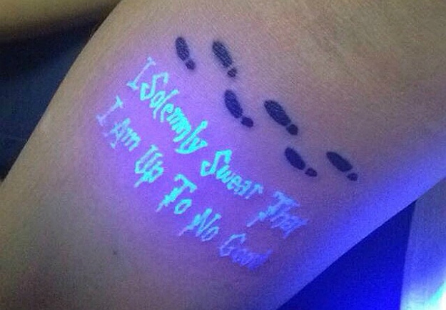 In the movie, the map only reveals its secrets if you tap it with a wand and say, “I solemnly swear that I am up to no good.” For the tattoo, that’s unfortunately not how you make it reveal its secrets. In fact, in normal light, the tattoo doesn’t look like anything other than a string of footsteps. Don’t let the simplicity fool you! Once the ink is seen in UV lighting, for example from a black light, the secret scribbling appears. It’s like magic!