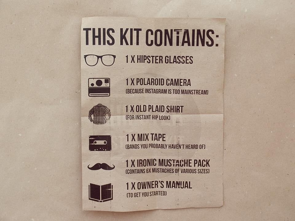 Just yesterday I wrote an article called Hipster Style Illustrated On A Funny Credit Card Bill which showcased the classic hipster look. Today I have something even better for you though. For all you hipster wannabes, I’ve got the Hipster Starter Kit. This kit comes complete with everything you need to sport some true hipster style. It has the hipster glasses, Polaroid camera (Instagram is so not hipster), plaid shirt, mix tape, mustache pack and owner’s manual to guide you through it all. With this starter kit, you can transform your look from non-hipster to full on hipster style in an instant.