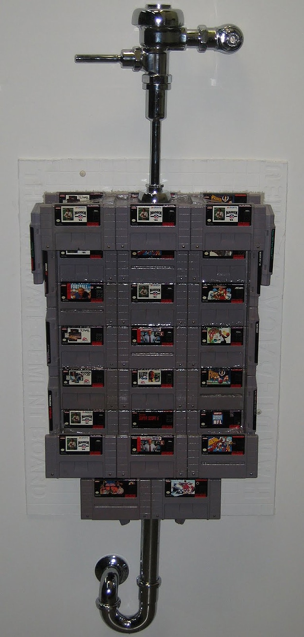 According to Price Charting, “Building a video game urinal takes about eight hours of labor and costs roughly $200-$250 (not counting the video games).” In order to make this urinal yourself, you’ll need 40 Super Nintendo games. All the games used in this urinal were broken or useless already. No good games were damaged.