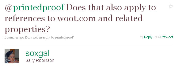A woot is a woot. Good point Sally. Woot.com is a cool place to buy stuff online. I wonder which woot came first? Here is one way to use @woot…