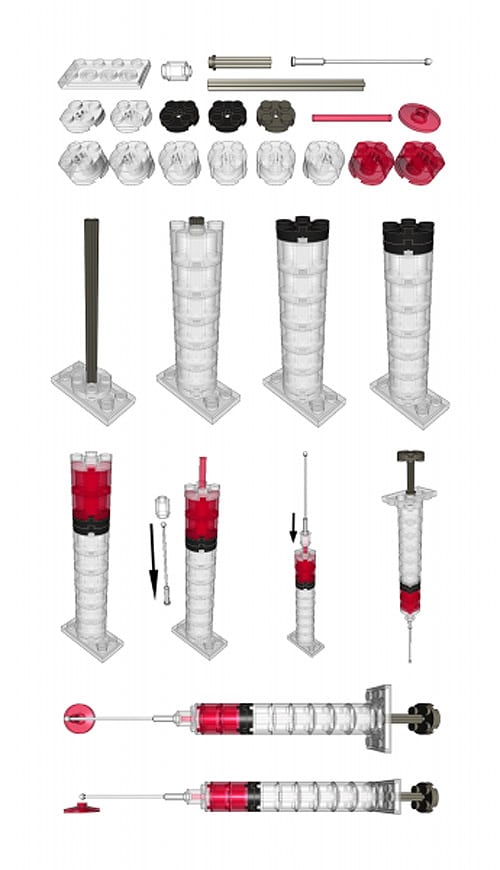 If you would like to make this for yourself, Sean has been kind enough to share the goods with us. You can buy a Lego Syringe Kit in his Etsy store for only $20 (this is just something Sean creatively put together, it is not affiliated with Lego). Also, on his website here, he has a complete parts list along with photos and a link to a PDF with detailed instructions. Thank you, Sean! :)