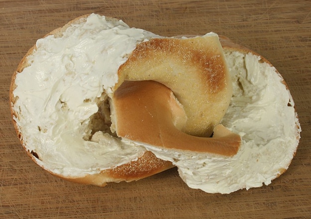 In order to do this, you must be able to visualize your bagel as having an X, Y and Z axis (are you having a geometry flashback yet?). You will need fine point red and black markers to do this (preferably Sharpies). The video below illustrates exactly how the cut should be made. When you are finished, you might even challenge yourself with a calculus question, “What is the ratio of the surface area of this linked cut to the surface area of the usual planar bagel slice?”