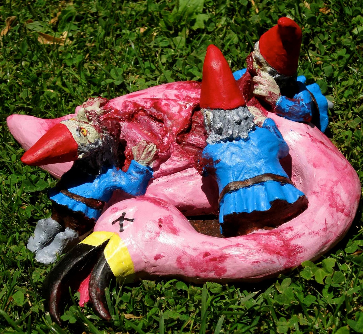 After searching gnomes on Etsy, I came across a shop owned by the user Chris and Jane’s Place. Chris and Jane’s Place specializes in making zombie gnomes. Some of their gnomes have come back from the dead to continue their love fest, while others prefer to munch on other garden ornaments, specifically pink flamingos. They may not exactly liven up a home, but they will certainly make the place more interesting, to say the least.