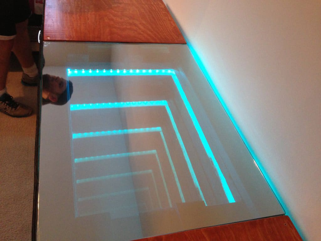Today I’d like to share with you another inspiring desk. This one is a tad more geeky, and it would probably work well for gamers, social media addicts, or anyone who likes to be on their computer late at night. It’s an infinity mirror computer desk made with LEDs, which gives the illusion of an endless journey downward.