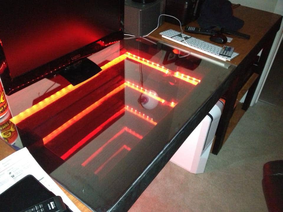 Imagine a night when you’ve stayed up gaming, or spent hours on Twitter and Facebook – this infinity mirror desk would definitely look trippy. If you’ve been concentrating on your best design while sitting in that chair all day, this interesting visual would probably be just what it takes to keep you smiling.