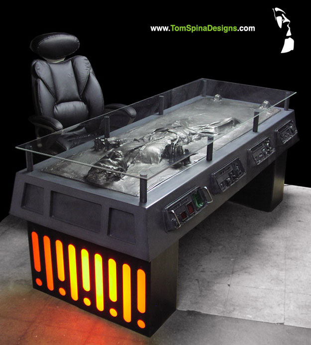 Introducing, the Han Solo Carbonite Desk: This particular desk is a one of a kind creation that was created by Tom Spina Designs for the lead singer of the group Casting Crowns. It is constructed out of steel and even has lights on the sides that create an orange glow. It took Tom and his crew two months to build this desk.