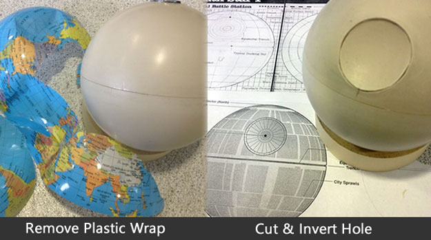 You’ll basically be transforming the globe into the Death Star. It’s the lighting that adds such a neat effect and makes it look so good. The size of your floating Death Star of course depends on the size of the globe you purchase. You’ll have to determine how much available space you have on your desk. Those globes start out small and go up to a standard size globe, which is pretty big.