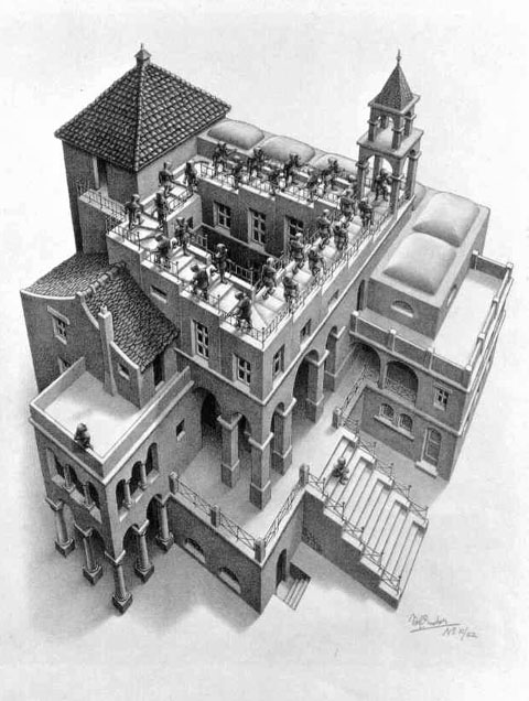 M.C Escher‘s Impossible Worlds are as legendary as they are mind boggling. Anyone who has ever laid eyes on them has discovered that you have to stop thinking in dimensions and start thinking out of the box. If you do that, the thrilling shapes and angles will become clear and ready to be solved.