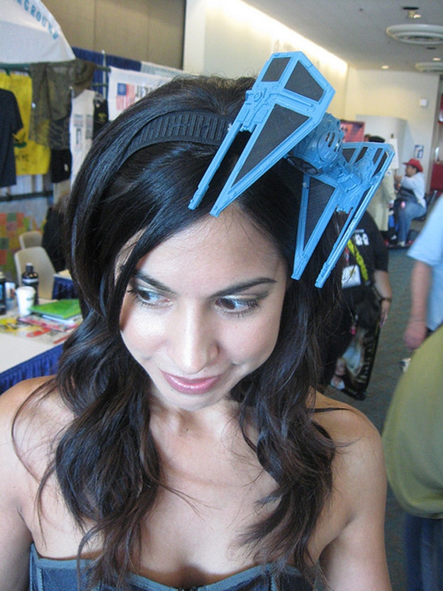 This Death Star dress seen at this year’s Comic-Con is quickly becoming one of my favorites also. You may recognize this girl. She is Jennifer Landa, and if you follow her on YouTube, you know she is a huge Star Wars fan. The galaxy tights and TIE interceptor bow in her hair are just stellar accessories! She even came up with the perfect name for her character, Miss Death Star.