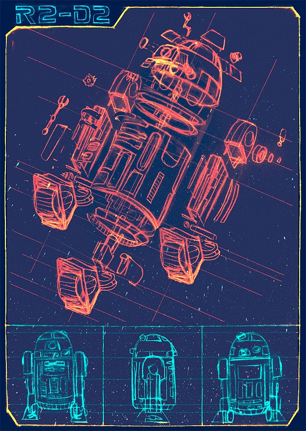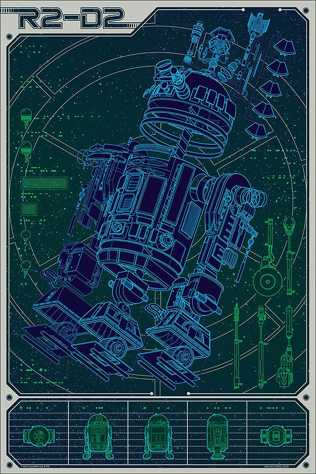 So, since I have a robot-crush on him, it stings a little to see this poster where he is dissected piece by piece. This R2-D2 deconstruction print, called “A Linch Pin Droid,” took Kevin Tong three months to complete (working 6-8 hours a day). The process by which he was able to uncover all the hidden places of R2-D2, many of which couldn’t be seen by the human eye in the movies, is fascinating. He watched the original trilogy dozens of times. He would have to pause certain parts and re-watch them over and over just to make sure every detail was right. In the video below you can see exactly how he did this.