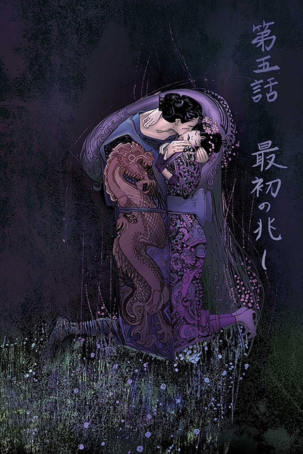 Here’s the cover to Elektra: The Hand #5, written by Akira Yoshida and released by Marvel Comics in February 2005. This art is done by Gossett Christian and features Elektra in an embrace with Kagenobu. The cool colours in this piece replace the warm colours of the original. The oriental motif still works to flatten the composition, but the lines and shapes are more dynamic. The figures are more refined as well, and carry with them just enough comic art aesthetic to make the whole piece work as a successful comic cover (which is offered as a print on art.com and other similar sites).