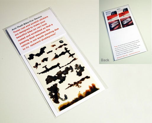 Dominic Wilcox is trying to change that. He created a series of very realistic looking temporary stickers that look like rust and scratches that you can stick to your car. The idea is that the thief will walk passed your car and choose a more desirable target that isn’t so junky looking. I’m sure there are people out there that will steal a car regardless of whether it has rust or scratches on it, but it’s still a cute idea that would probably work some of the time.