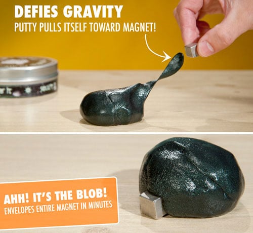 Well, all that has changed. Introducing… the silly putty of the future. According to vat19, “Millions of tiny micron-sized magnets are embedded in each handful of Magnetic Thinking Putty. Use the included super-strong neodymium iron boron cube magnet to control the putty like a snake charmer.”