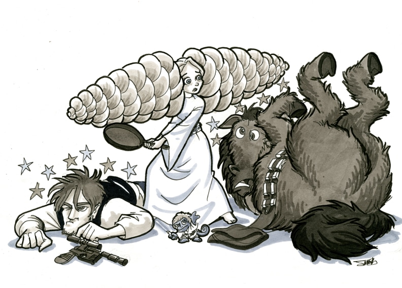 The nagging feeling of how it will all play out won’t go away, and many people have started doodling all kinds of Disney characters sneaking their way into the Star Wars galaxy. They are Disney characters that would completely destroy the saga as we know it. Of course we will never see any Disney characters in any Star Wars movies anytime soon, but the spoofs have made sure that at least we get to see some Disney characters trying to blend into the Star Wars world. Some of these illustrations are created by the insanely talented illustrator James Silvani. I have been able to find 10 illustrations of Disney characters, drawn by James, that are trying to sneak their way into the Star Wars galaxy with the help of props that I think we are all familiar with nowadays. Does it work? Well, let’s just say that I don’t think Disney would be so stupid as to incorporate any other characters into Star Wars based on their previous mega hit franchises. That’s just my two cents.