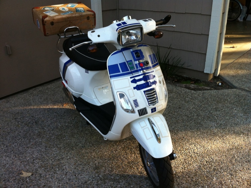 This particular Star Wars mod, or more specifically, this R2-D2 mod, is really in a class of its own. This thing is freaking awesome, and I’d give up my over-sized, inefficient car in a heartbeat if I could scoot around Atlanta on this. This is a Vespa (which is an Italian brand of scooter) that has been modded into a super fabulous R2-D2. The first thing I thought of when I saw this is that I know the perfect helmet to wear too! Check out this badass R2-D2 Helmet, which was made by another fan. They go perfectly together.