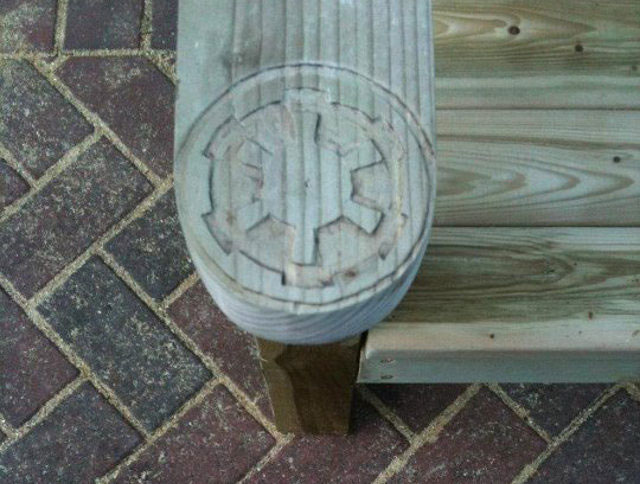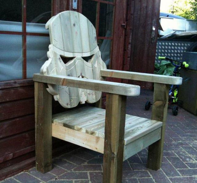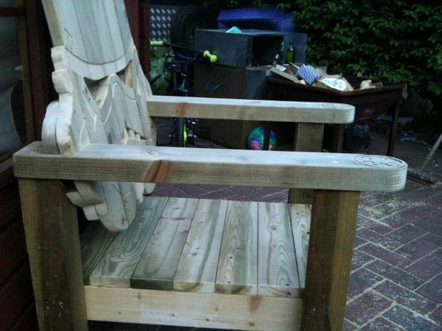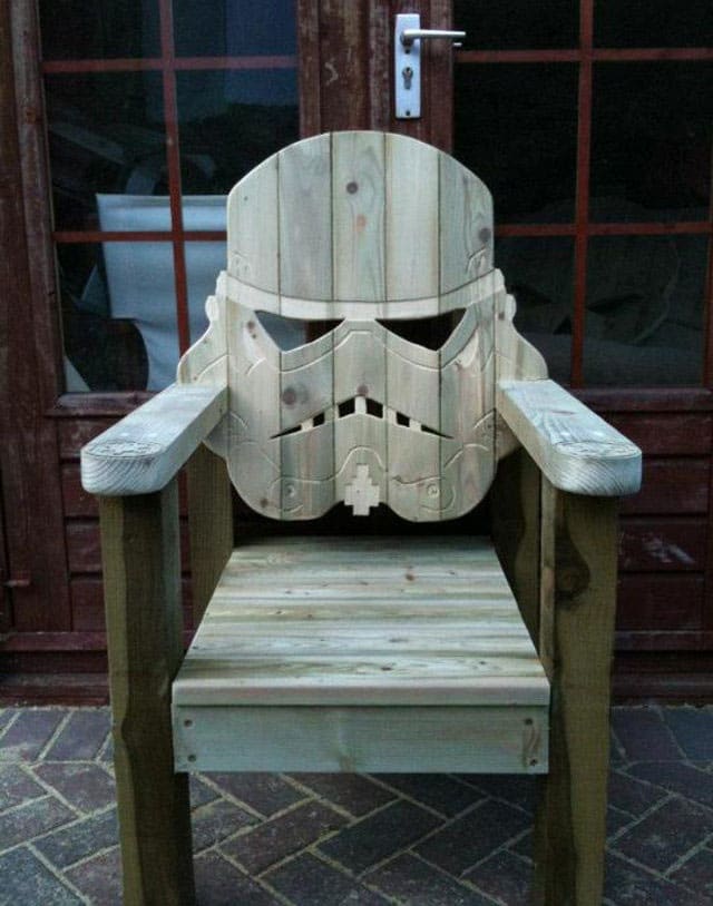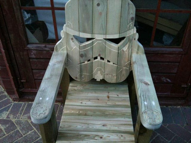 This beauty was created by GotWood Workshop. According to Facebook, he won’t be making any more of these which is a bummer. He does offer to make a chair for you from your own design though. Is that a hint that he’ll make you a stormtrooper if you are the one who will get sued by George instead of him? Who knows. All I know is I want one of these really, really badly. It would look so good as part of an ultimate lawn chair set with a Yoda, Darth Vader and Leia one too. He’s apparently making a badass Teenage Mutant Ninja Turtle bench (with all four turtles) soon also. That sounds awesome!