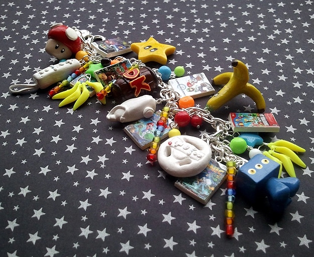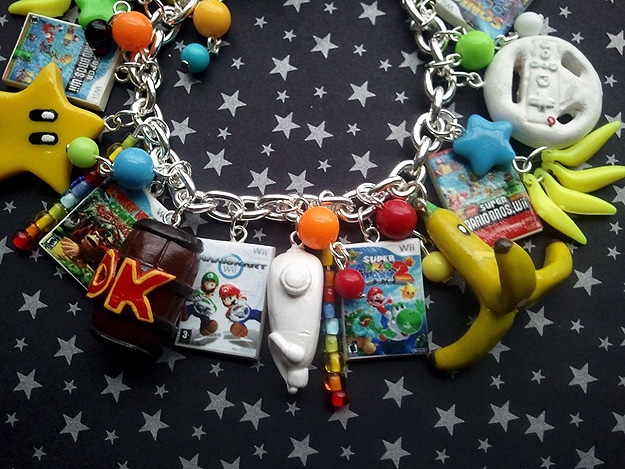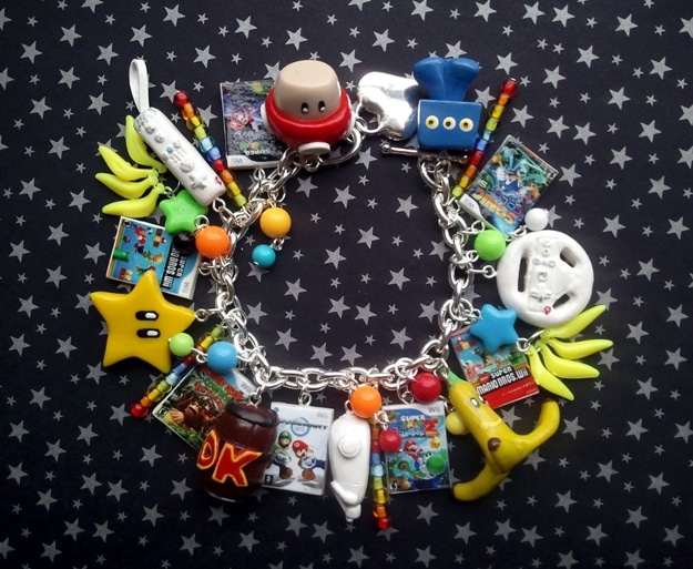This is a one-of-a-kind Wii video game charm bracelet. If you look closely, you’ll see all your favorite Wii video game stuff on here. There are 15 charms in all, and each one is handmade. In the pictures, you can see a Wii remote, a nunchuk, tons of games, the steering wheel, the stars, the mushroom, a Donkey Kong barrel and much more.