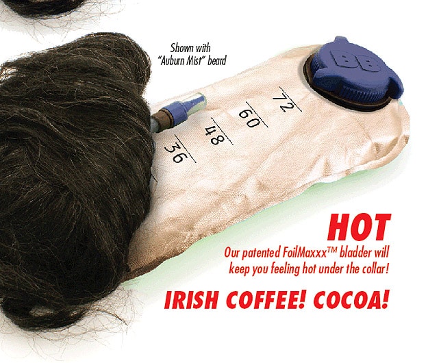 Underneath this hairball of nastiness (Opps… did I just type that?), there is a plastic water bottle looking thingy that holds up to 72 ounces of your favorite alcoholic beverage. You just strap this badboy to your face and off you go! The special straw that you will drink through is the patented “Thirs-T-Tooob.”