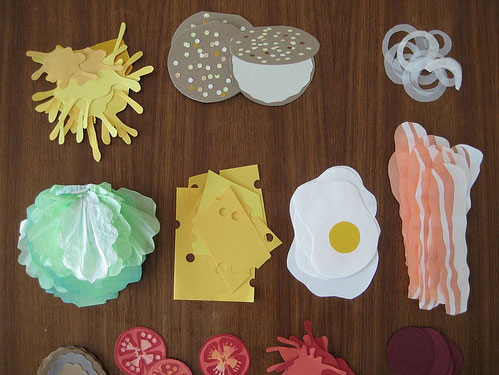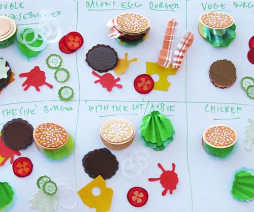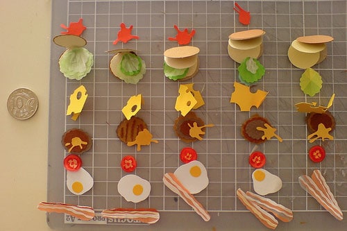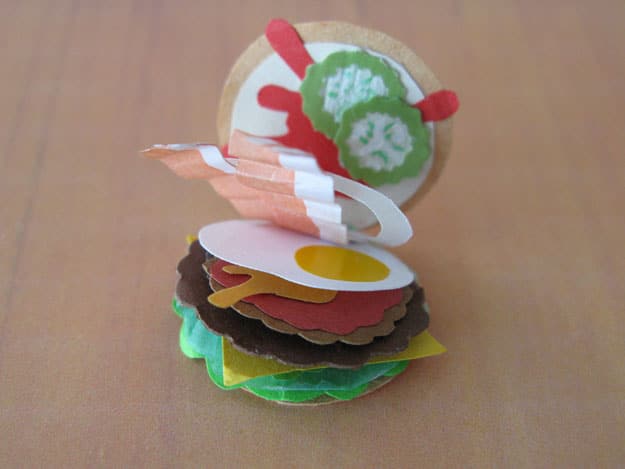 These particular examples, created by Stephanie Anderson, are part of her “Bite-Sized Burger Zine” collection. These are tiny paper/card sandwiches where each ingredient is a separate card.
