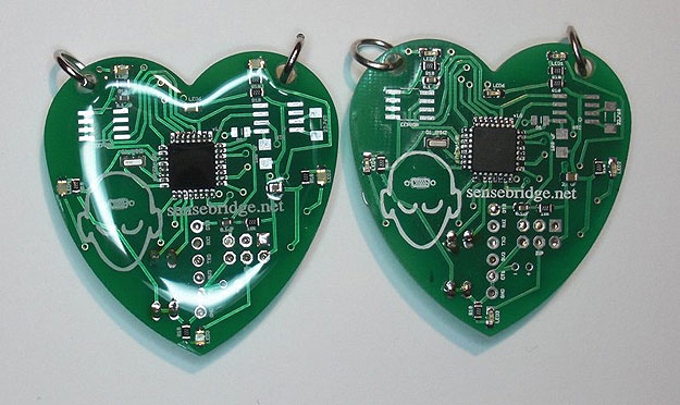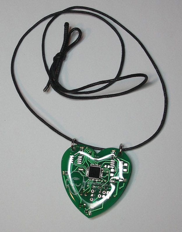 According to the video below, the chest strap picks up your heartbeat with electrocardiograms and then transmits it wirelessly to the receiver on the back of the pendant. Then, once your heartbeat is synced, the circuit flashes little LEDs in a circle on the front of the pendant. Yes, it does take a battery (a CR2032 coin-cell battery).