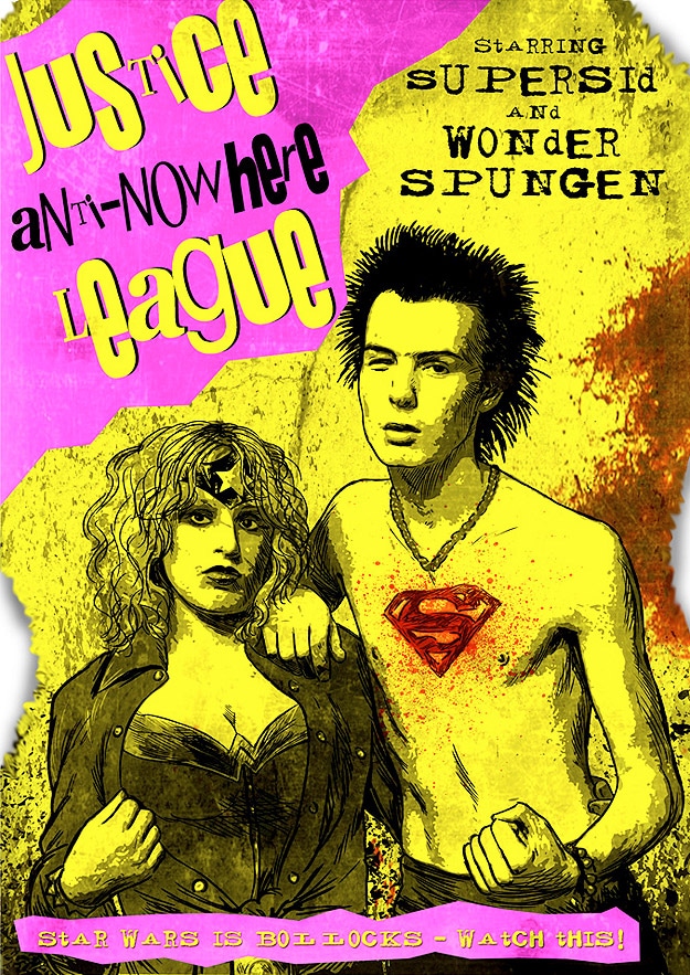 The artists created these as part of Warren Ellis’ Remake/Remodel Forum Challenge. I didn’t even know about this challenge until I read about it on Geek-O-System today. Apparently it happens weekly, and judging from the comments, this ain’t your average Photoshop contest. They do not mess around, and if you submit something cheesy, you will totally get called out. I love it. This week, the challenge was to imagine what it would look like if the manager of the Sex Pistols got the rights to the Justice League in 1977 and made a movie of them. The third picture below was a fan favorite, and I can see why. Actually, all of these are amazing! Check out the original thread for the artists’ names and the full display of submissions.