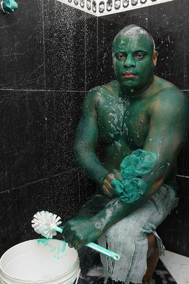 I’ve seen this story making the rounds on lots of blogs over the past few days, and since I giggle every time I see it, I decided to share it with you. I don’t know which is funnier – the fact that this guy accidentally painted his skin with industrial strength green paint, or that in these pictures you can see his mother scrubbing his skin with a toilet brush.