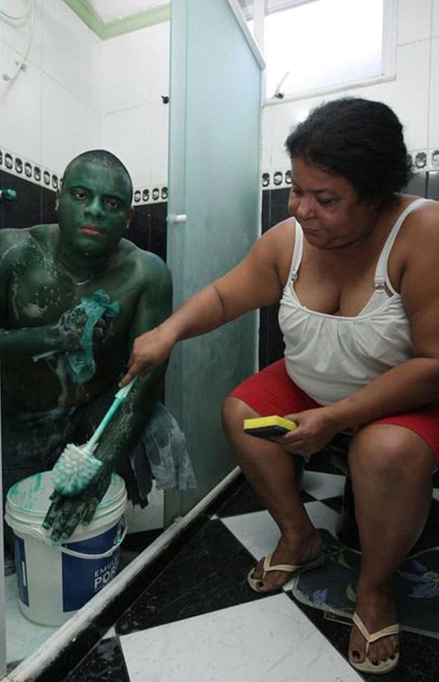 After painting his body with it, and after the event was over, guess what happened? Yup, the paint wouldn’t come off. Paulo took 20 baths in two days with no luck. As a last resort, he let his friends and family scrub him for 24 hours, and it finally came off. Dang, I’m no paint expert, but that probably doesn’t mean the paint came off his skin, but more likely that they scrubbed his green skin off, right? Eeewww… that sounds painful. I bet it was fun to have green skin for a few days though. At least he got famous on the Internet over the whole ordeal. I hope your mom got over it by now. She looks annoyed in that picture. #justsayin