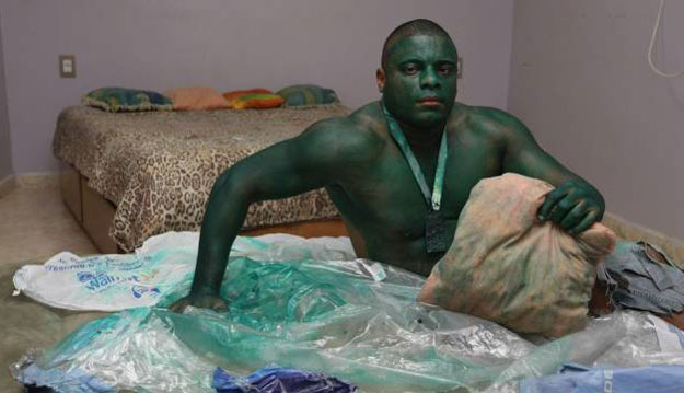 Paulo Henrique dos Santos, a 35-year-old pool boy living in Brazil, wanted to color his skin green for an event so he would look like Hulk. Apparently he’s a frequent body painter because he has a particular kind of paint that he normally uses.