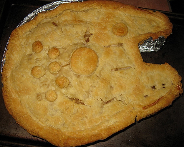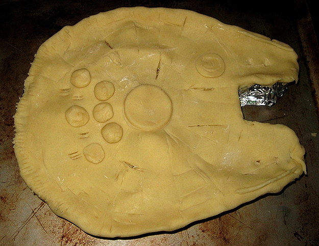 This is a hella cute Star Wars apple pie. It makes the tiny apple pie baked inside an apple that I wrote about yesterday look so boring. It’s funny how today’s hero can be tomorrow’s zero. You might be asking yourself, “Why would I want to make an apple pie that looks like a Millennium Falcon?” Well, because you can. Star Wars fans really need no other reason than that.
