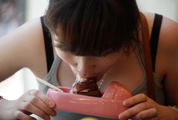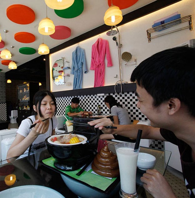 Each person dining here sits on a toilet. The tables have glass tops with sinks underneath them. The food is served in mini toilet bowls, and the drinks are served in plastic urinals. The soft serve chocolate ice cream, a’la poop style, is the bonus at the end.