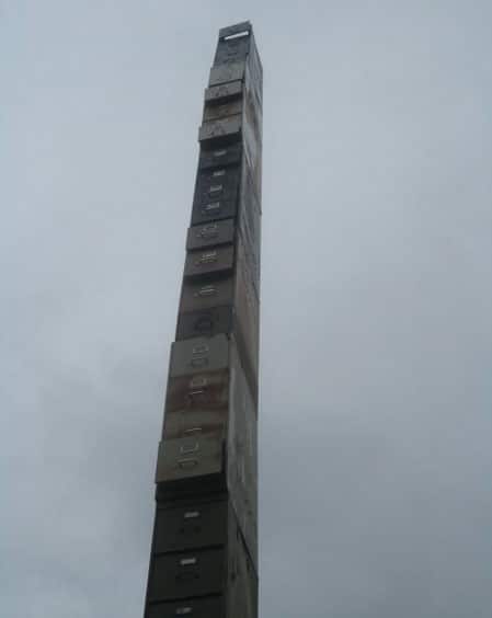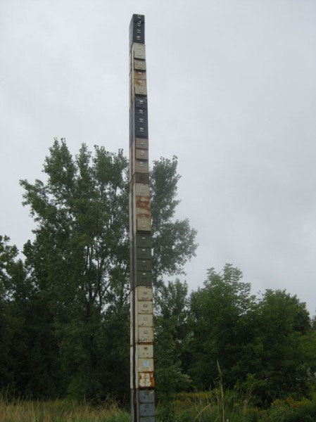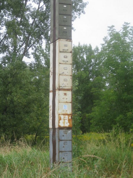 It’s located in a field of weeds off Shelburne Street (route 7) on Flynn Avenue between Pine and Foster Street. I know, totally random. It’s a stack of 38 rusty file cabinets welded on top of each other. I read online in several places that some of the drawers of the file cabinet are open, and birds and other creatures have made cozy little homes inside. Omg, how cool is that?