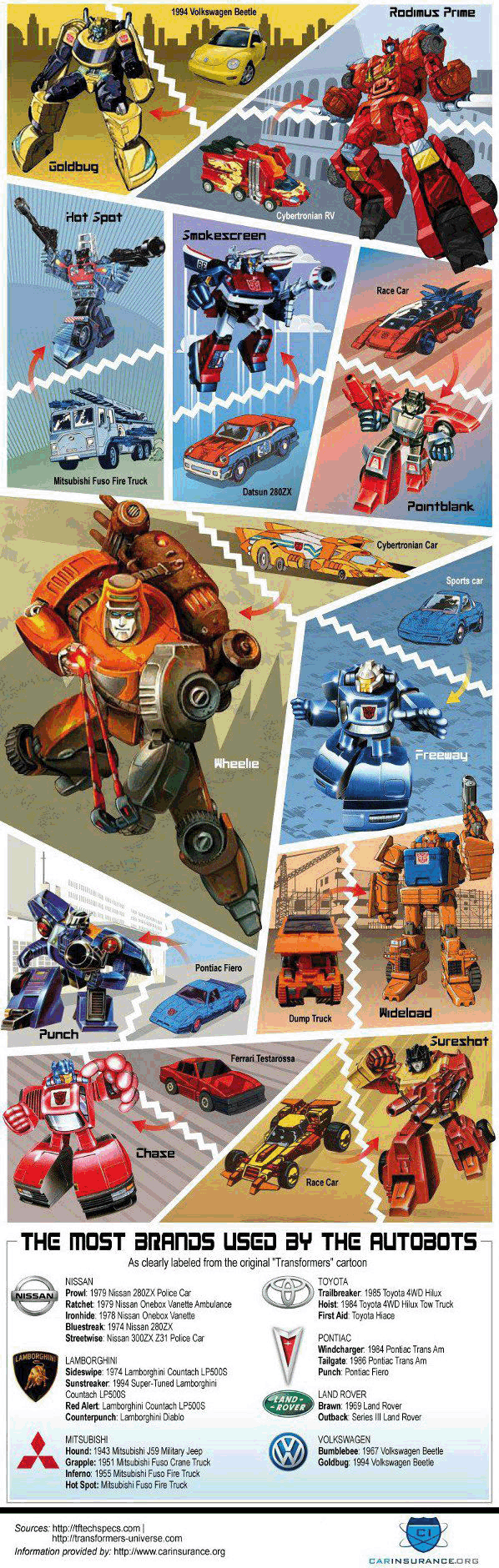Carinsurance.org created this awesome infographic which lists all the cars behind the robots in Transformers. Some of the names you will have seen before, while some others will be new (depending on whether or not you are a true Transformers fan or not). I say the creators did an amazing job putting this one together. Geekology for sure!