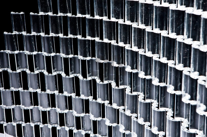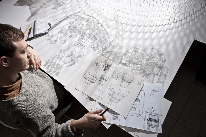 He created curved modules with the LEGO pieces so they would reflect light in the most beautiful way. It displays the day light and the evening light differently and eloquently, just like a chandelier should. You can see the photo with his schematic drawings below.