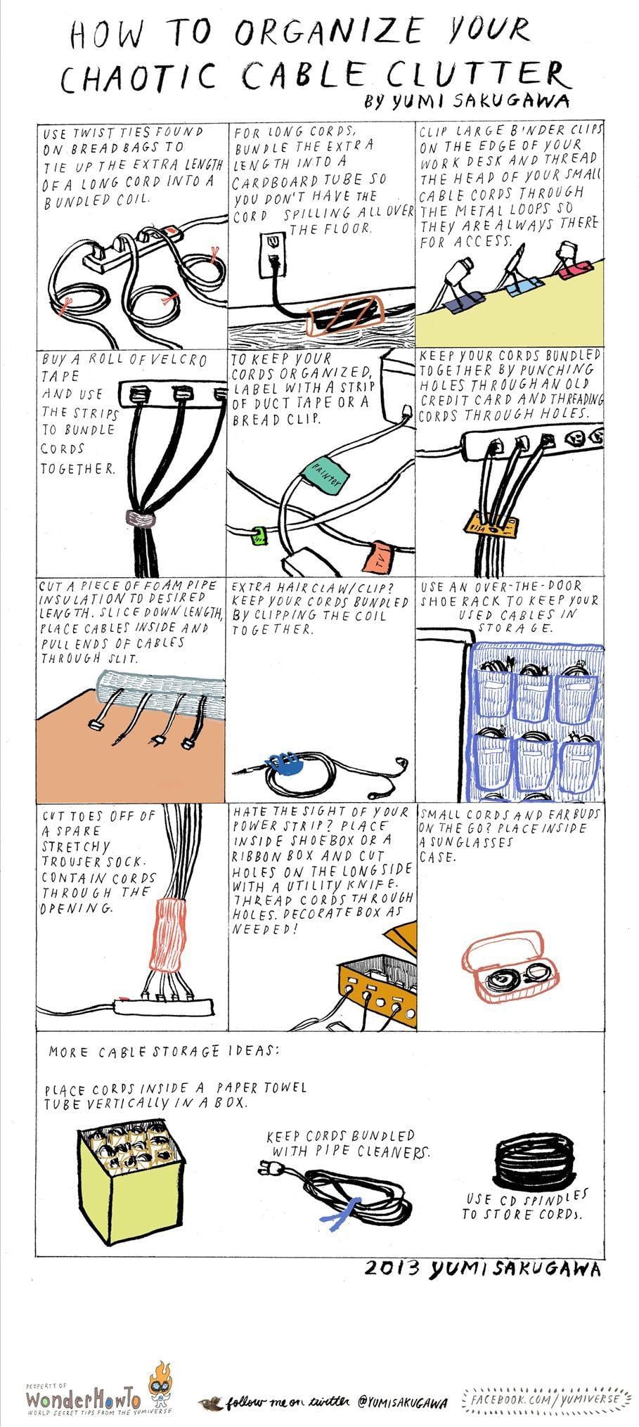 Like I said, there are tons of cord organizers we can buy to fix the problem, but what if you want to do something a little more creative? What if you want to make your own cord organizer from things you already have around the house? You can do that, and if you already have these things, you’ll be able to make some nifty ways to organize your cods without it costing you any money. This list comes from the always fun Yumi Sakugawa at WonderHowTo in a chart called How To Organize Your Chaotic Cable Clutter.