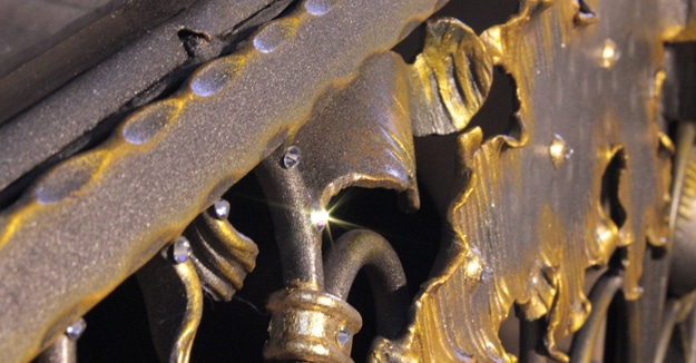 “Wrought iron is an iron alloy with a very low carbon (0.1 to 0.25) content in contrast to cast iron and has fibrous inclusions, known as slag. This is what gives it a “grain” resembling wood, which is visible when it is etched or bent to the point of failure. Wrought iron is tough, malleable, ductile and easily welded.” – Wikipedia