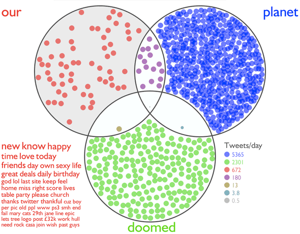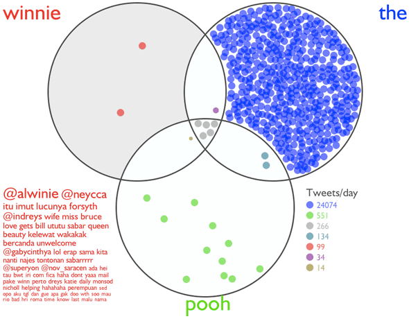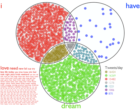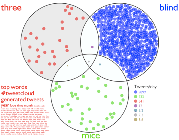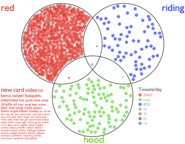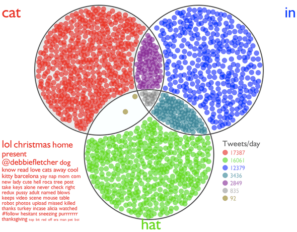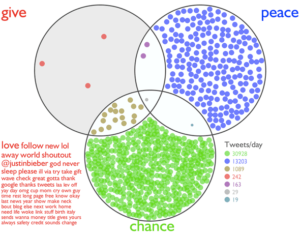 After taking statistics classes for years and years, some of it must have rubbed off on me. Now that I’m actively involved in the internets, my observations in pattern recognition have been ramped to an extraordinary amount. I just love uncovering new ways of analyzing data and fiend for any kind of data visualization or infographic. So when I stumbled upon a site that automagically produced Venn diagrams with keywords that I could pick… well, let’s just say I was elated. Yes, I know. Nerdy and kind of sad. Well, it’s my sad and nerdy.