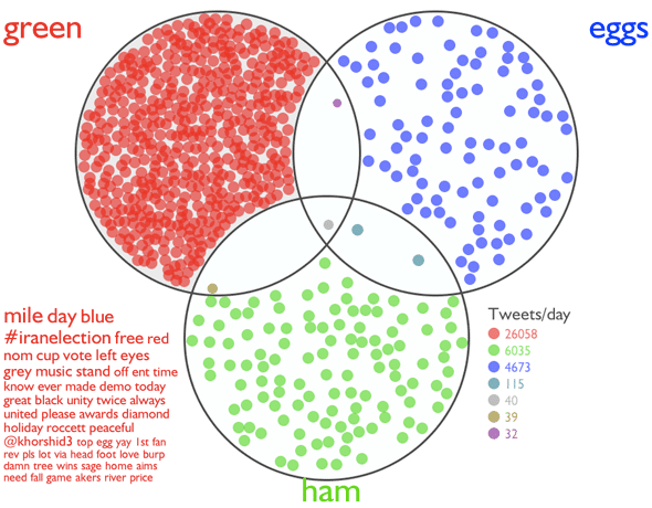 Must have been breakfast time because 40 people were talking about green eggs and ham while 115 people are just having plain eggs and ham. I’ll have to check out how many Canadian’s are in the mix with a ‘maple syrup’ variable next time.