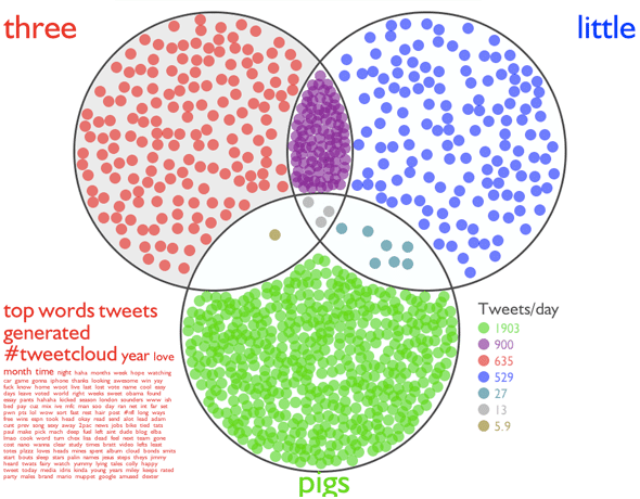 Now the three little pigs, they’re internet famous with the whole #bacon thing and all. At that particular moment 13 people were referring directly to them, 27 referring to the little pigs and 900 people talking about three little things.