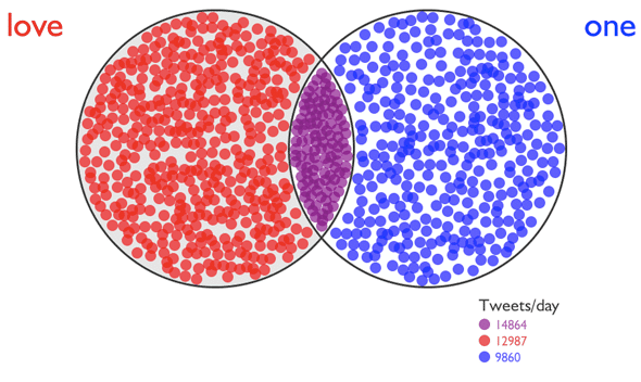 It all boils down to love. And when it comes down to these Venn diagrams, it’s just like the title says: You venn some, you lose sum. The last diagram is the only sample whose metrics lie outside of our traditional pattern. You see, there are 9,680 mentions of one and 12,987 mentions of love. If however, you were looking for one love, then 14,864 converge to find it.