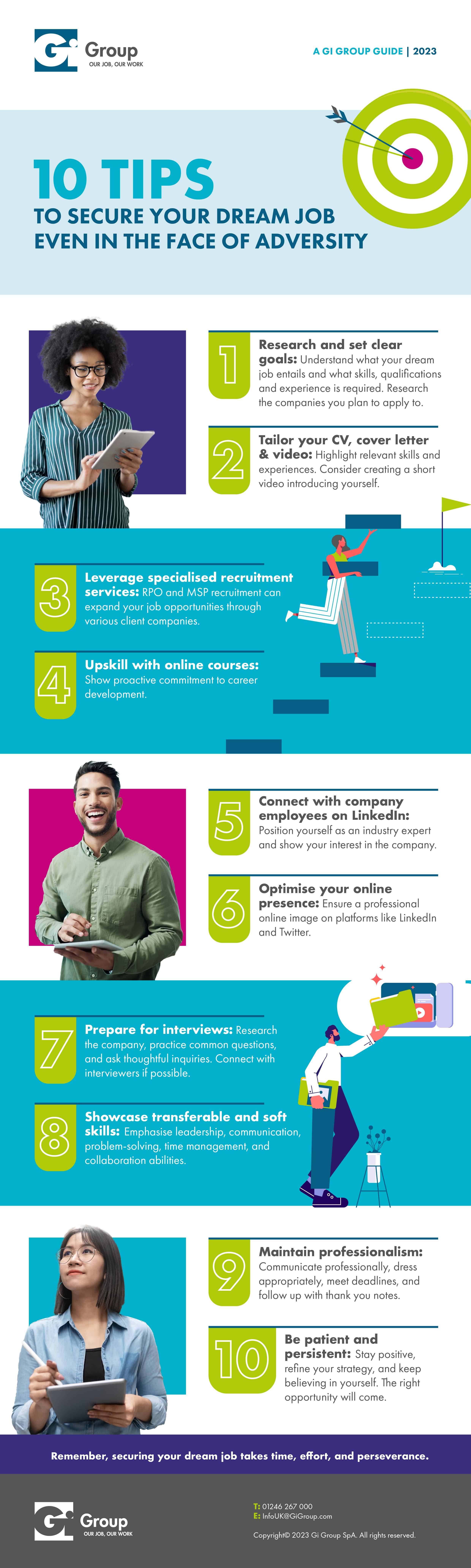 In this infographic, Gi Group sets out to give you 10 tips on how to secure your dream job. Getting that dream job doesn’t have to be impossible, especially if you know a few tips and tricks that can aid you in the process of getting it.
