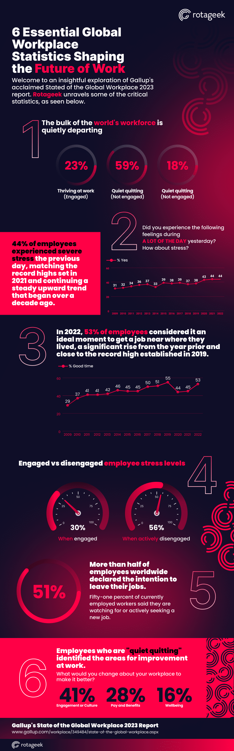 In this infographic, rotageek takes us on a journey through 6 essential global workplace statistics that are shaping the future of work. The fact that 51% of employees worldwide declared the intention of leaving their jobs should come as a wake-up call to many business owners. It’s time to make work fun again!