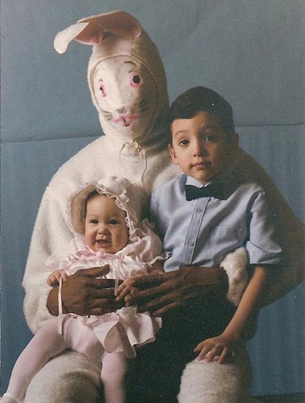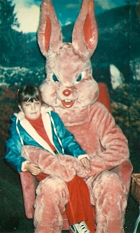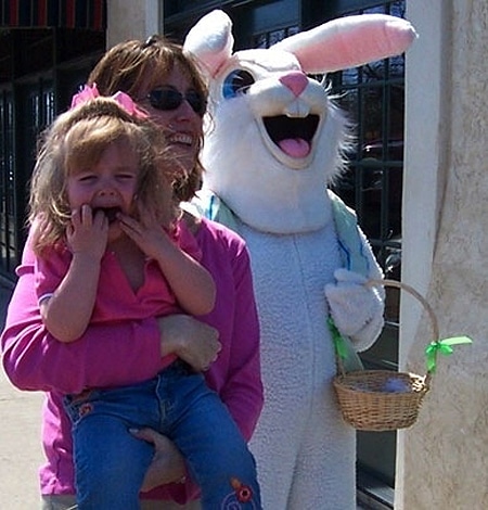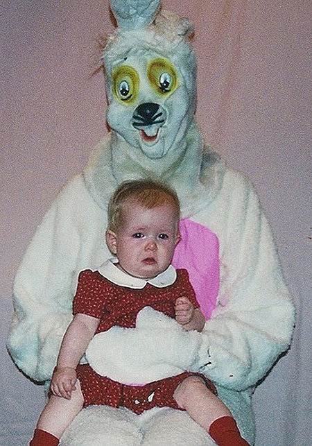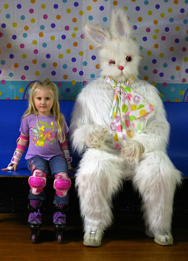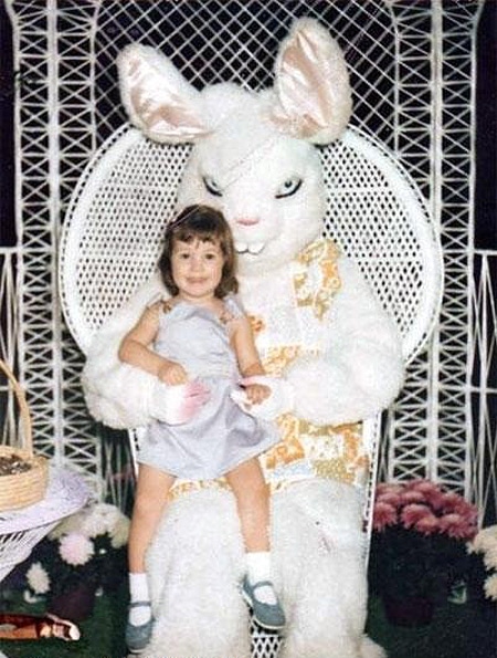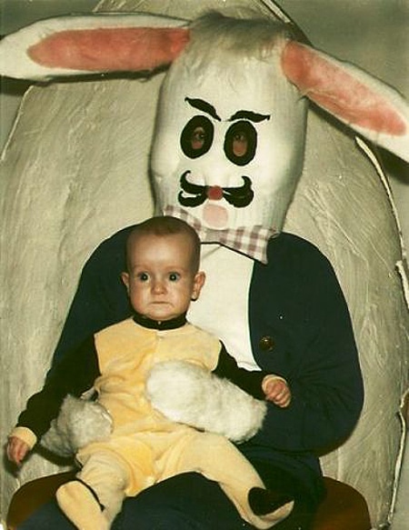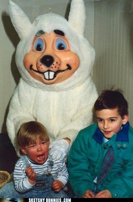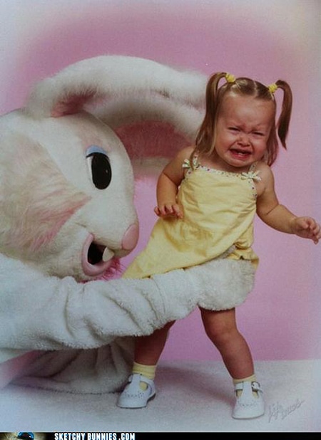 Let me get right to the point. Is it just me or is the Easter Bunny creepy as hell? Let me rephrase that… If you were from another planet, and if you looked down on our society, wouldn’t you think it was a little strange that some loving parents make their kids sit on the lap of a horrific huge bunny just for the sake of an Easter picture?