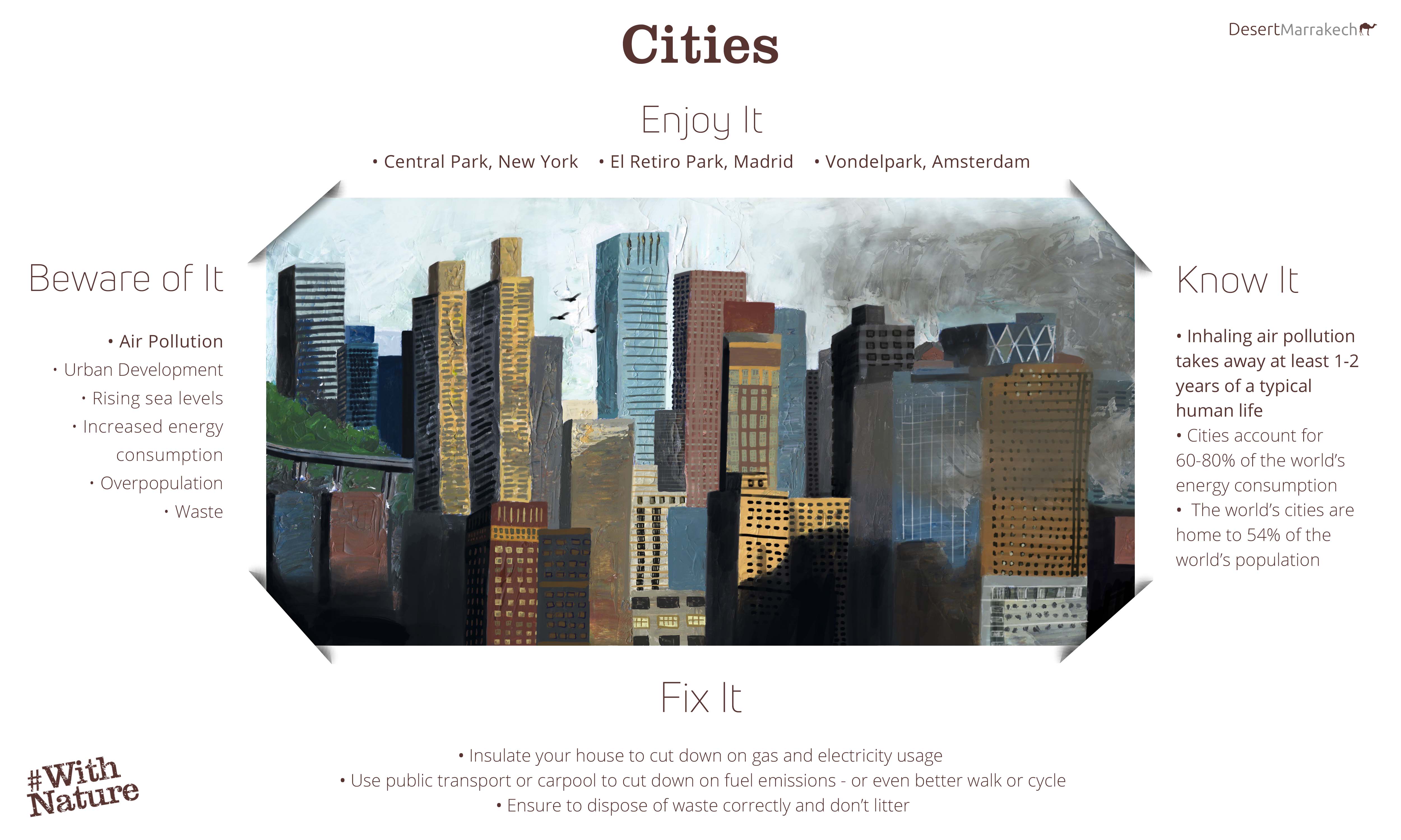 Cities – The urban areas constantly suffer at the hands of air pollution and the rising mounds of waste. As a responsible citizen, you can play your role in protecting the cities by disposing of your household waste in the proper manner. Say no to littering, to ensure a cleaner and less polluted urban landscape. Use of public transport or carpooling is an effective way to keep the air pollution in check.