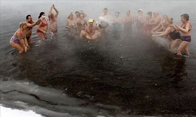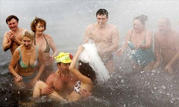 The ceremony took place in the Enisel River in the city of Krasnoyarsk in Siberia. I suppose swimming in this kind of weather in Siberia isn’t all that uncommon after all. You can read more about it in this article entitled Going To Extremes: Would You Swim Here? The really cute part of this story is that they couldn’t get a priest to get in the water to marry them, so they exchanged rings and cheered in the water, and then went into a warm cozy wood cabin for the “official” ceremony. Aww… how sweet! Congratulations Sergel and Irina!