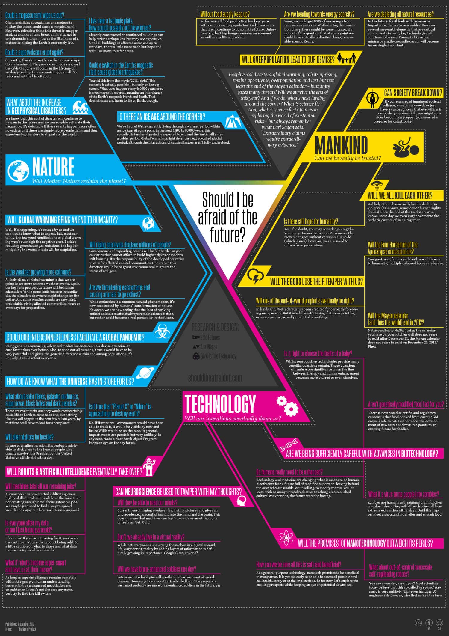 However, prepping is becoming more and more popular in the United States, and I do keep my own little stash of emergency supplies on hand so I’ll be able to cope with any unexpected events. After all…you never know. Futurist Mitchell Zappa at Envisioning Technology was asked about ways the world could end, and he answered by creating this comprehensive graphic below which will make you giggle a bit. According to Fast Company he said, “New developments in science and technology and their implications in society often lead to worries, usually because of lack of information. Humor is a great way of addressing these issues, as it takes out the seriousness a little.”
