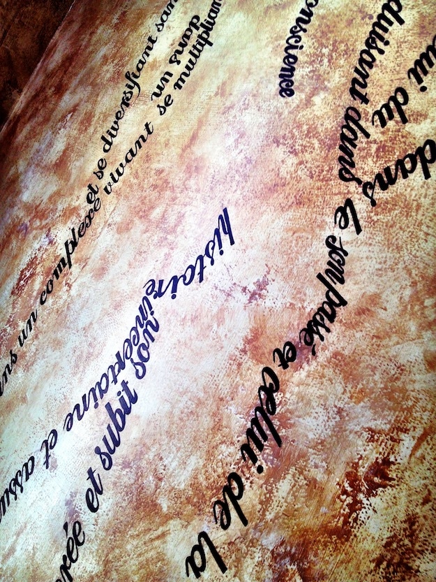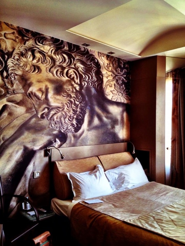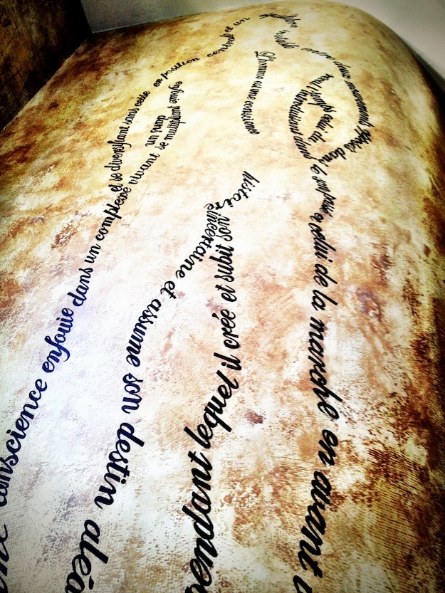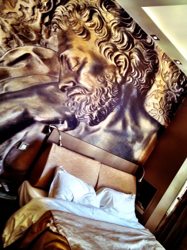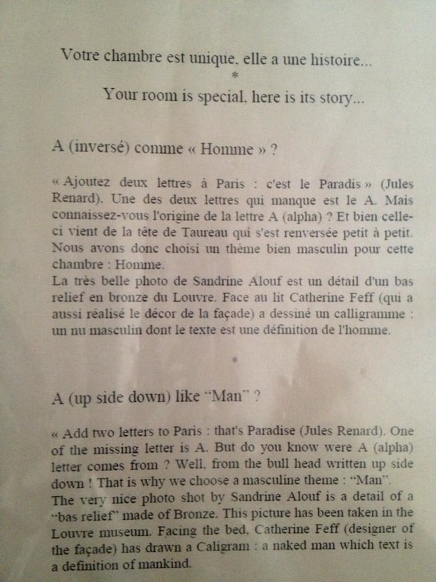 As you ascend to your room, you walk the winding staircase, stepping over a rug stitched with lettering, as if each stair is whispering words you can’t quite decipher but you follow them anyway. The theme of my Apostrophe Hotel room was “Homme.” The room comes with its very own ‘Once Upon A Time’ instruction manual in a binder that reads: “Your room is special, here is the story…”  In the chambre “Homme,” there is a giant bronze man towering over the bed facing a sketch of a naked man formed from “text that is the definition of mankind.” Even the shower is crafted to feel like an illuminated high-tech rain room.